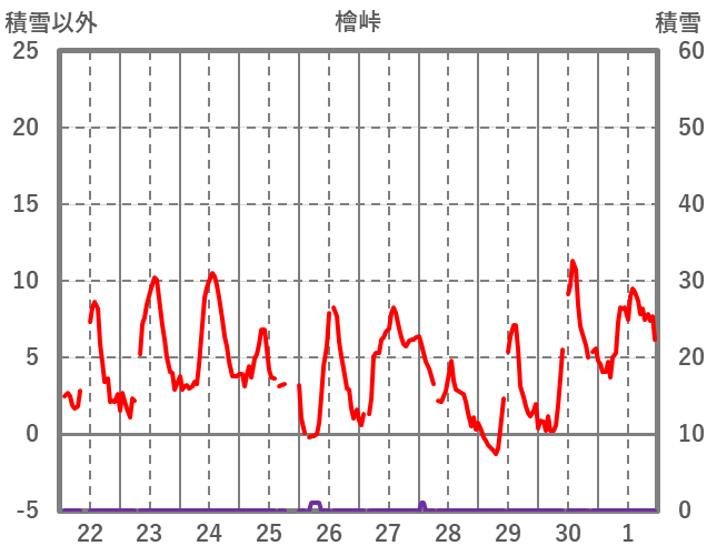 | 日 | 時 | 気温 | 降水 | 風向/風速 | 日照 | 積雪 | 降雪 |