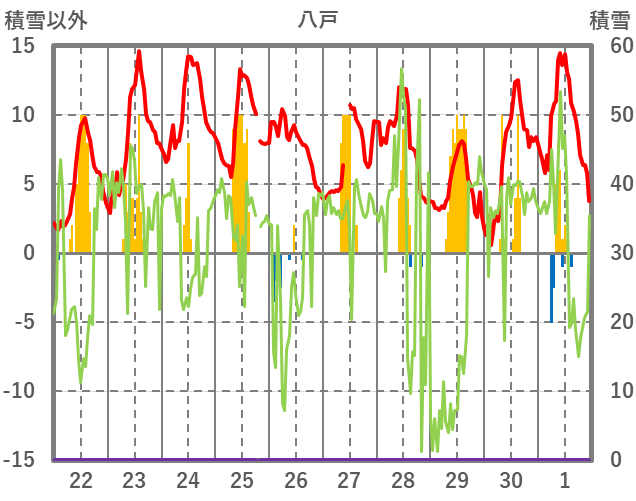| 日 | 時 | 気温 | 降水 | 風向/風速 | 日照 | 積雪 | 降雪 |