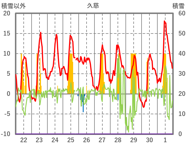 | 日 | 時 | 気温 | 降水 | 風向/風速 | 日照 | 積雪 | 降雪 |