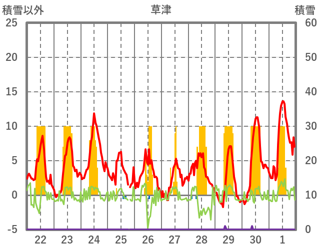 | 日 | 時 | 気温 | 降水 | 風向/風速 | 日照 | 積雪 | 降雪 |