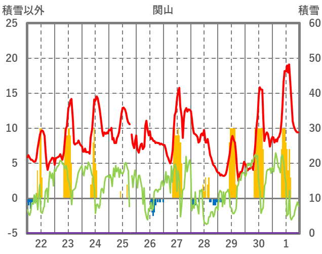 | 日 | 時 | 気温 | 降水 | 風向/風速 | 日照 | 積雪 | 降雪 |
