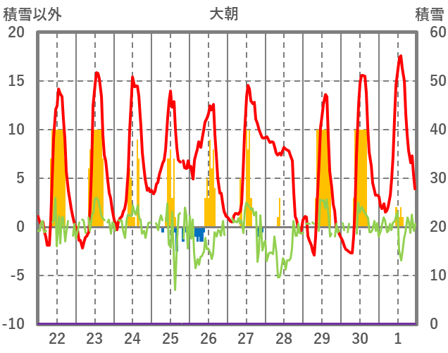 | 日 | 時 | 気温 | 降水 | 風向/風速 | 日照 | 積雪 | 降雪 |