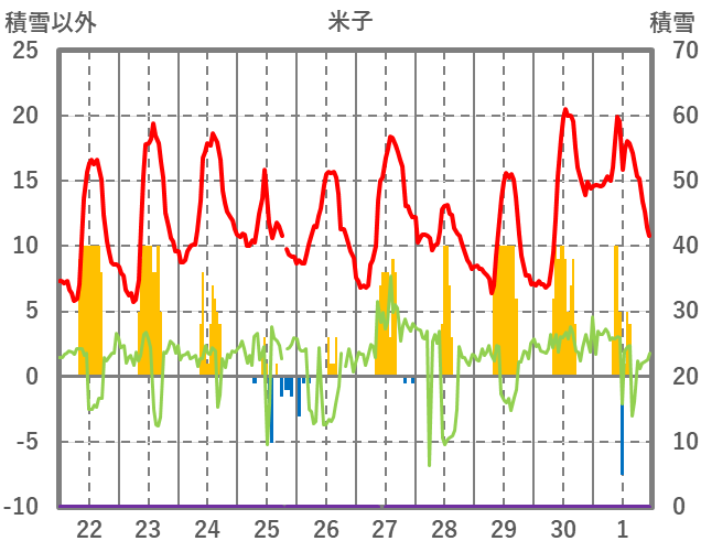 | 日 | 時 | 気温 | 降水 | 風向/風速 | 日照 | 積雪 | 降雪 |