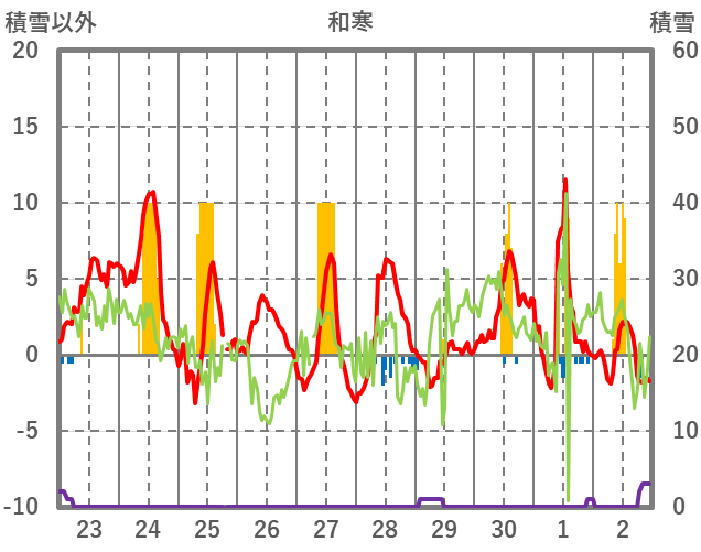 | 日 | 時 | 気温 | 降水 | 風向/風速 | 日照 | 積雪 | 降雪 |