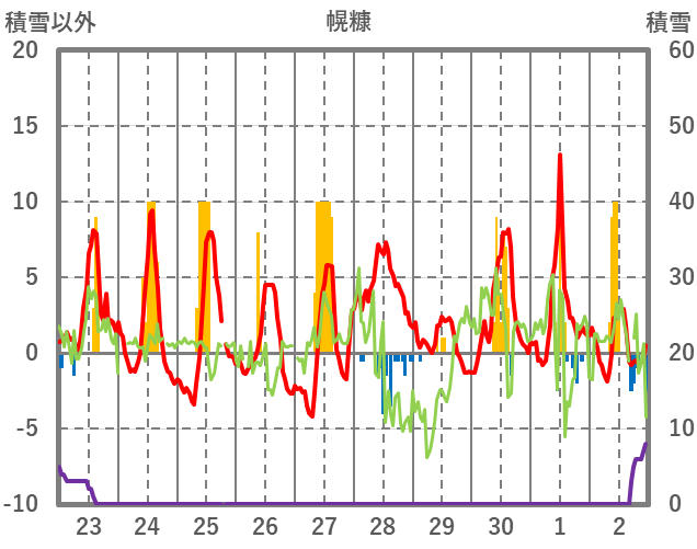 | 日 | 時 | 気温 | 降水 | 風向/風速 | 日照 | 積雪 | 降雪 |