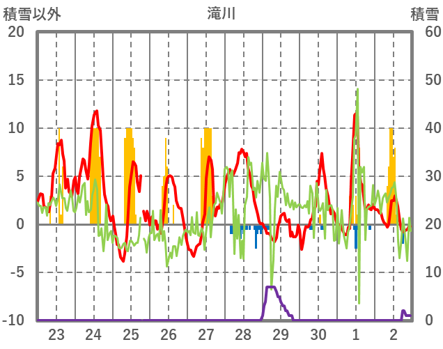 | 日 | 時 | 気温 | 降水 | 風向/風速 | 日照 | 積雪 | 降雪 |
