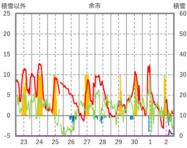 | 日 | 時 | 気温 | 降水 | 風向/風速 | 日照 | 積雪 | 降雪 |