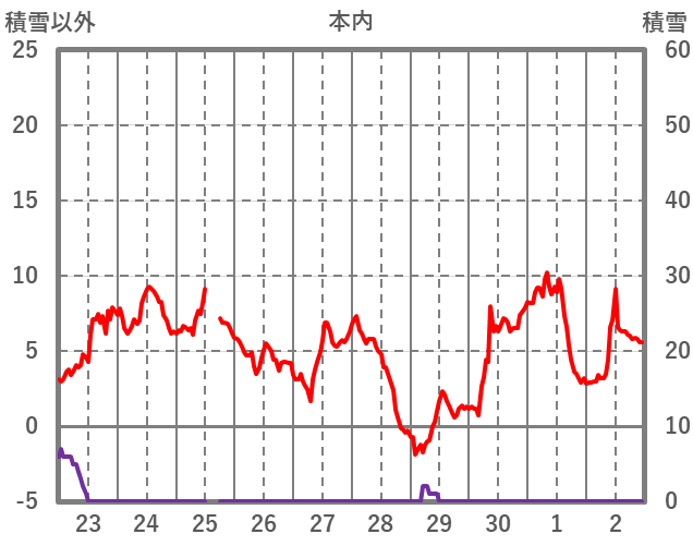 | 日 | 時 | 気温 | 降水 | 風向/風速 | 日照 | 積雪 | 降雪 |