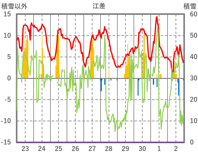 | 日 | 時 | 気温 | 降水 | 風向/風速 | 日照 | 積雪 | 降雪 |