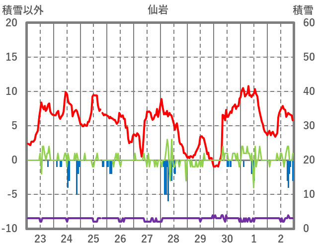 | 日 | 時 | 気温 | 降水 | 風向/風速 | 日照 | 積雪 | 降雪 |