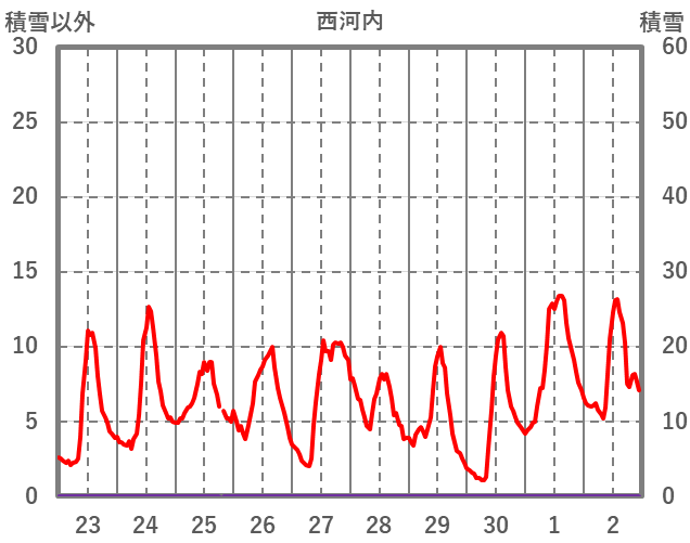 | 日 | 時 | 気温 | 降水 | 風向/風速 | 日照 | 積雪 | 降雪 |