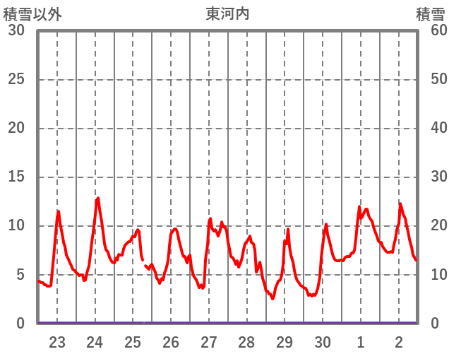| 日 | 時 | 気温 | 降水 | 風向/風速 | 日照 | 積雪 | 降雪 |