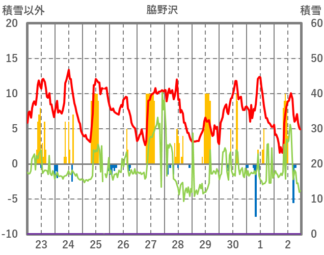 | 日 | 時 | 気温 | 降水 | 風向/風速 | 日照 | 積雪 | 降雪 |