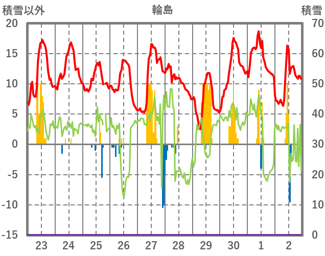 | 日 | 時 | 気温 | 降水 | 風向/風速 | 日照 | 積雪 | 降雪 |