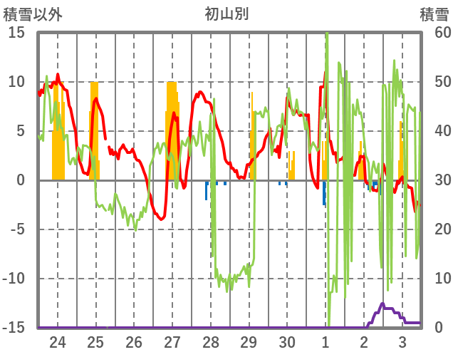| 日 | 時 | 気温 | 降水 | 風向/風速 | 日照 | 積雪 | 降雪 |