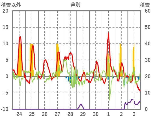 | 日 | 時 | 気温 | 降水 | 風向/風速 | 日照 | 積雪 | 降雪 |