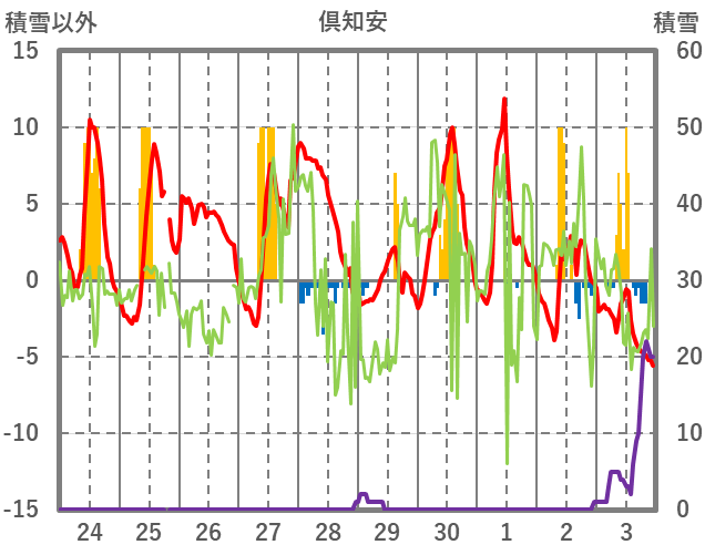 | 日 | 時 | 気温 | 降水 | 風向/風速 | 日照 | 積雪 | 降雪 |