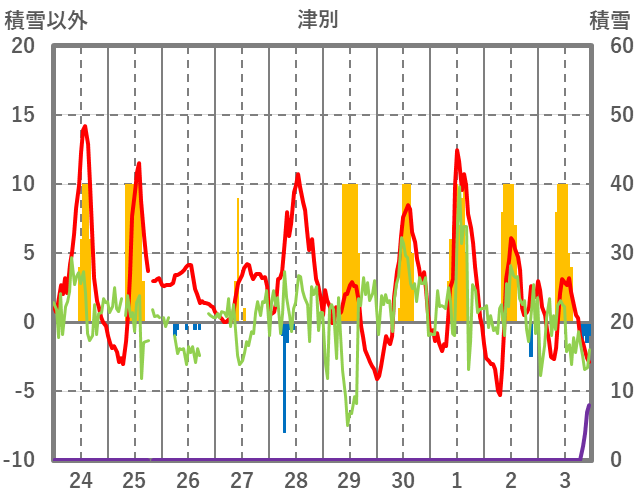 | 日 | 時 | 気温 | 降水 | 風向/風速 | 日照 | 積雪 | 降雪 |