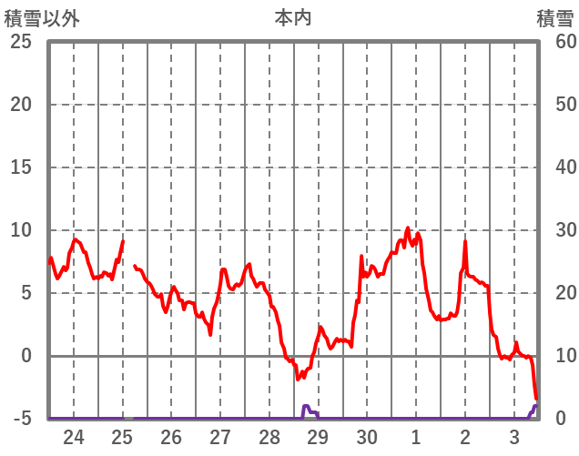 | 日 | 時 | 気温 | 降水 | 風向/風速 | 日照 | 積雪 | 降雪 |