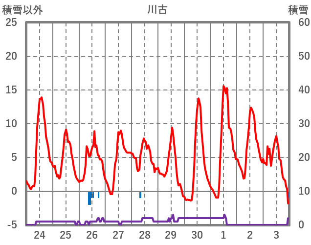 | 日 | 時 | 気温 | 降水 | 風向/風速 | 日照 | 積雪 | 降雪 |