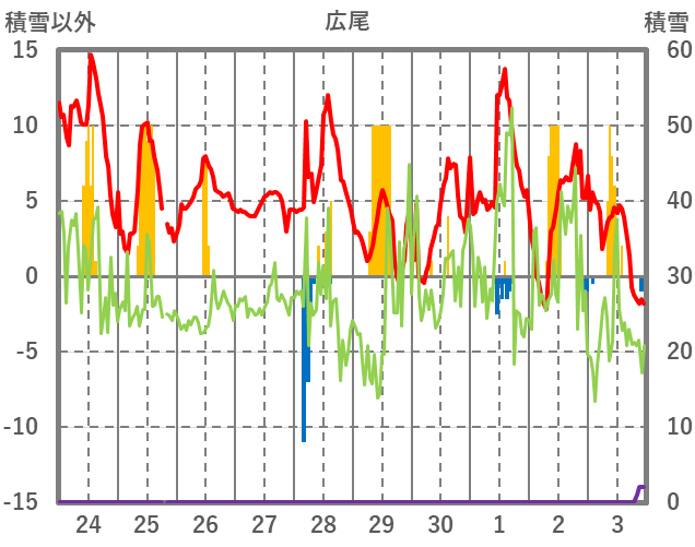 | 日 | 時 | 気温 | 降水 | 風向/風速 | 日照 | 積雪 | 降雪 |