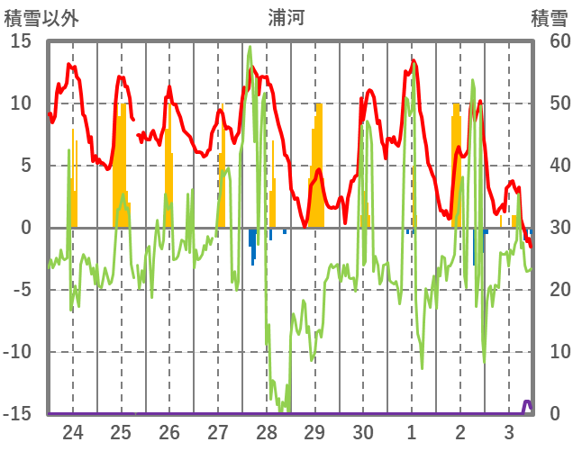 | 日 | 時 | 気温 | 降水 | 風向/風速 | 日照 | 積雪 | 降雪 |