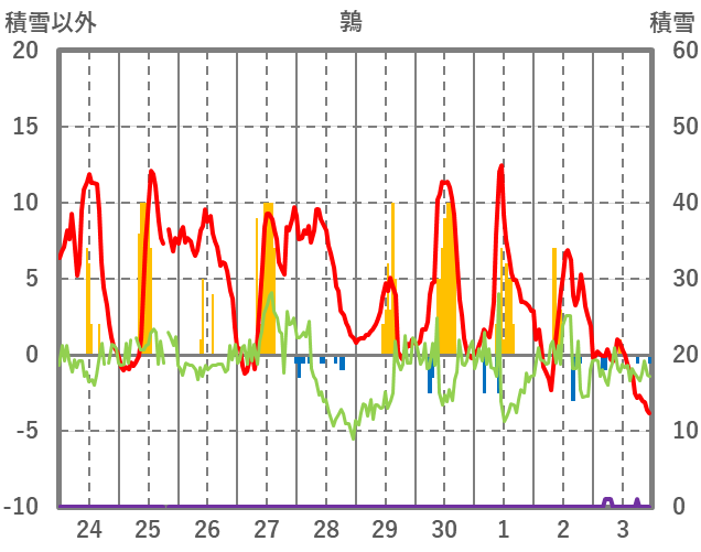 | 日 | 時 | 気温 | 降水 | 風向/風速 | 日照 | 積雪 | 降雪 |