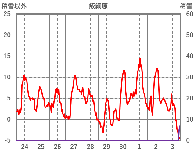 | 日 | 時 | 気温 | 降水 | 風向/風速 | 日照 | 積雪 | 降雪 |