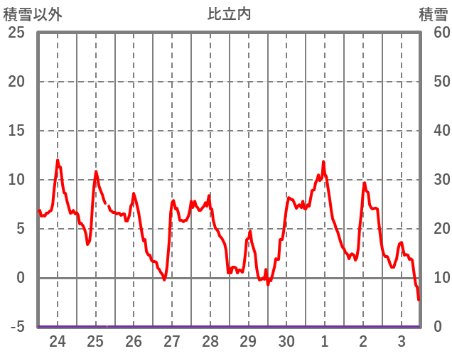 | 日 | 時 | 気温 | 降水 | 風向/風速 | 日照 | 積雪 | 降雪 |