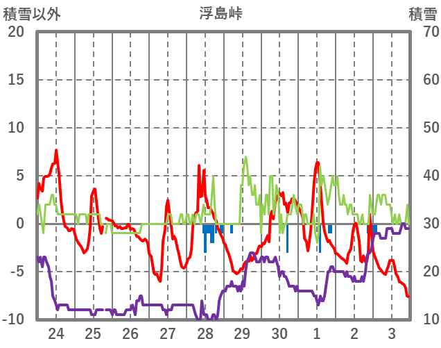 | 日 | 時 | 気温 | 降水 | 風向/風速 | 日照 | 積雪 | 降雪 |
