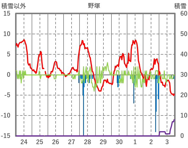 | 日 | 時 | 気温 | 降水 | 風向/風速 | 日照 | 積雪 | 降雪 |