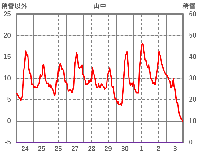 | 日 | 時 | 気温 | 降水 | 風向/風速 | 日照 | 積雪 | 降雪 |