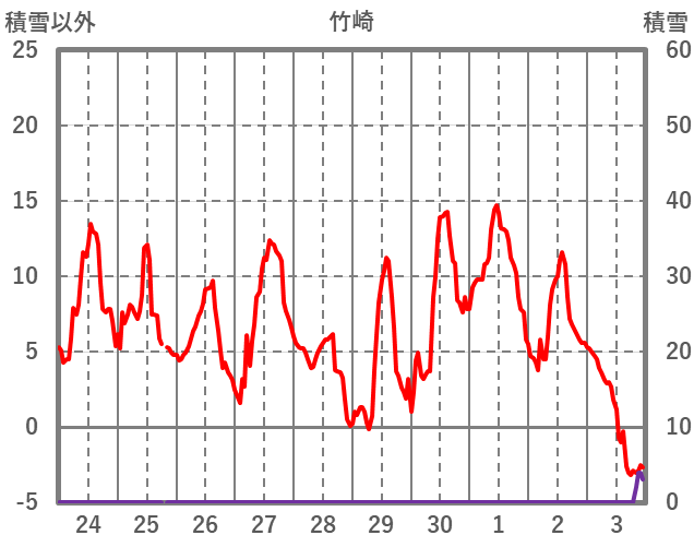 | 日 | 時 | 気温 | 降水 | 風向/風速 | 日照 | 積雪 | 降雪 |
