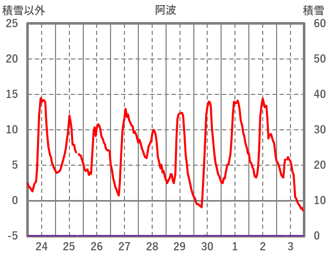 | 日 | 時 | 気温 | 降水 | 風向/風速 | 日照 | 積雪 | 降雪 |