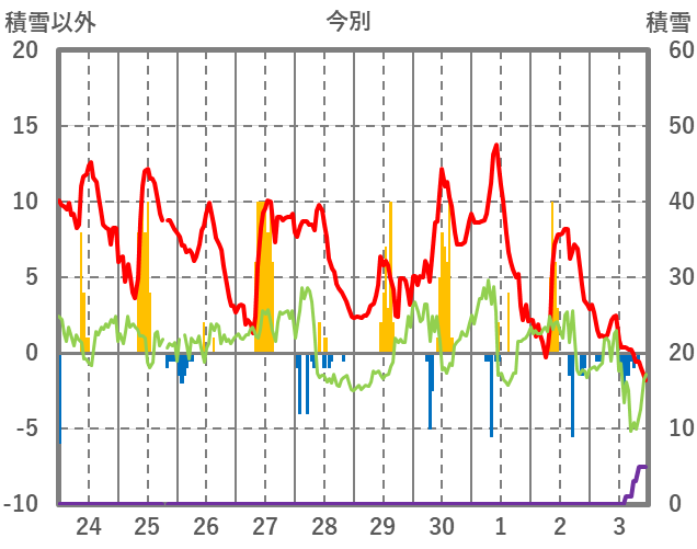 | 日 | 時 | 気温 | 降水 | 風向/風速 | 日照 | 積雪 | 降雪 |
