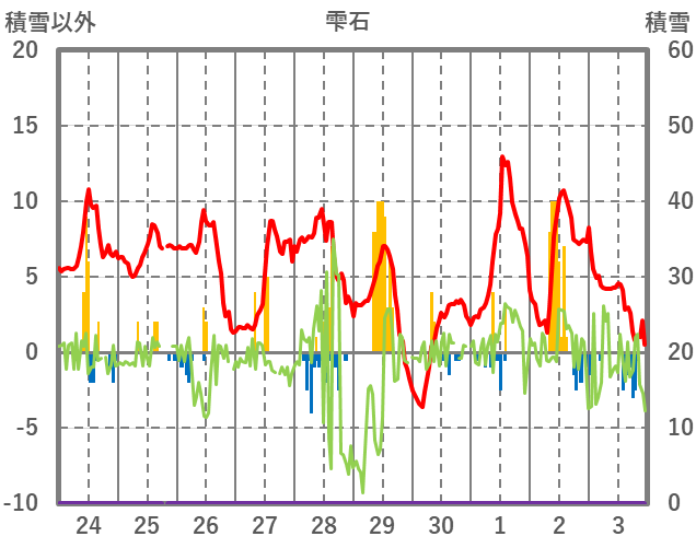 | 日 | 時 | 気温 | 降水 | 風向/風速 | 日照 | 積雪 | 降雪 |