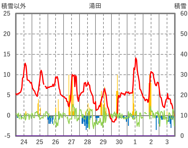 | 日 | 時 | 気温 | 降水 | 風向/風速 | 日照 | 積雪 | 降雪 |