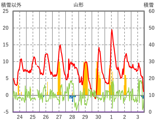 | 日 | 時 | 気温 | 降水 | 風向/風速 | 日照 | 積雪 | 降雪 |