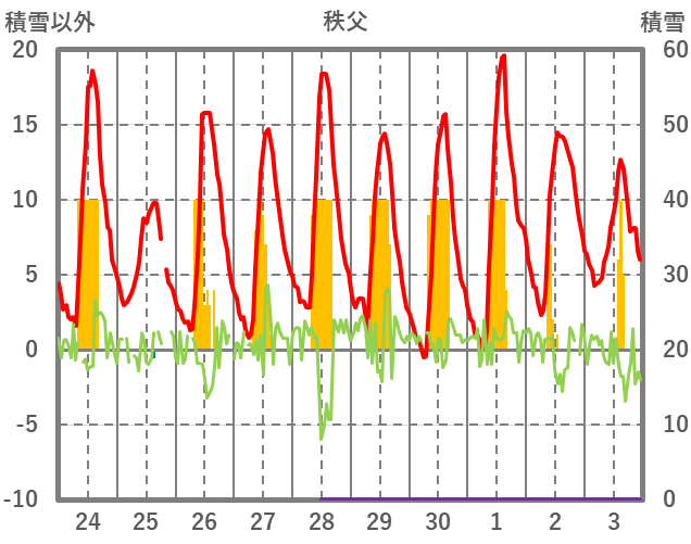 | 日 | 時 | 気温 | 降水 | 風向/風速 | 日照 | 積雪 | 降雪 |