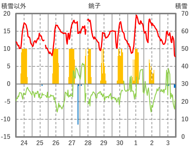 | 日 | 時 | 気温 | 降水 | 風向/風速 | 日照 | 積雪 | 降雪 |