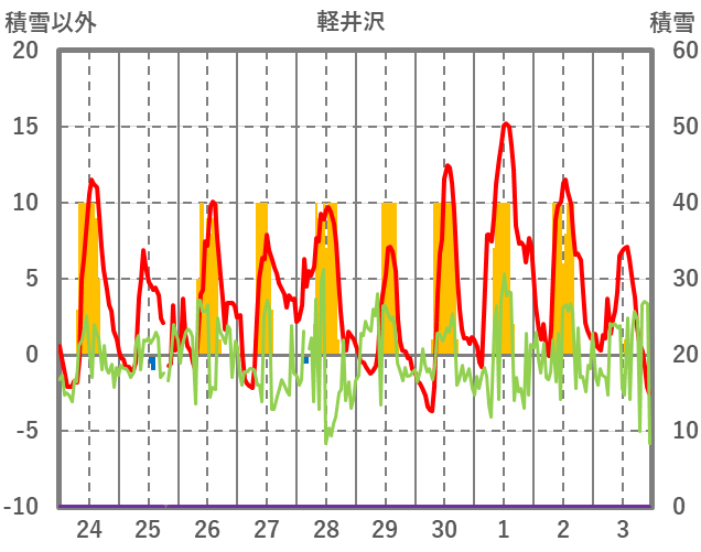 | 日 | 時 | 気温 | 降水 | 風向/風速 | 日照 | 積雪 | 降雪 |