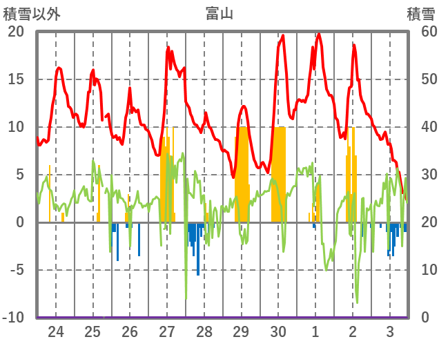 | 日 | 時 | 気温 | 降水 | 風向/風速 | 日照 | 積雪 | 降雪 |