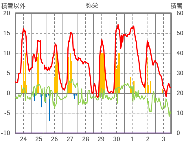 | 日 | 時 | 気温 | 降水 | 風向/風速 | 日照 | 積雪 | 降雪 |