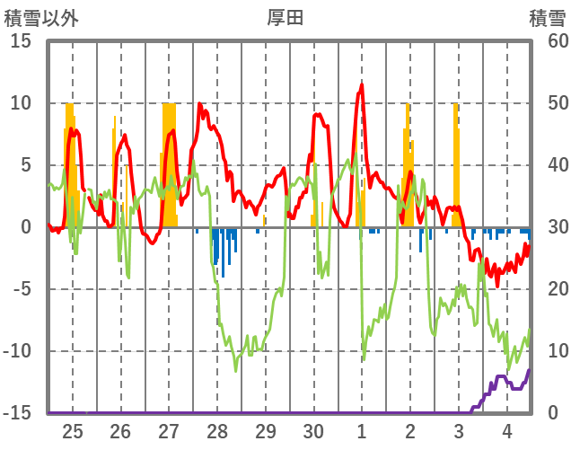 | 日 | 時 | 気温 | 降水 | 風向/風速 | 日照 | 積雪 | 降雪 |