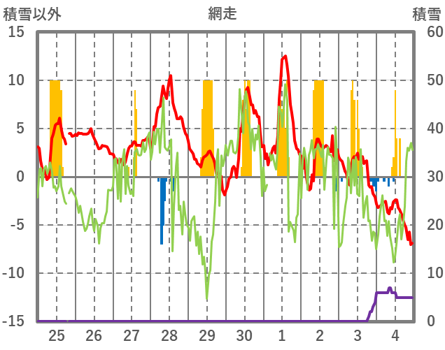 | 日 | 時 | 気温 | 降水 | 風向/風速 | 日照 | 積雪 | 降雪 |
