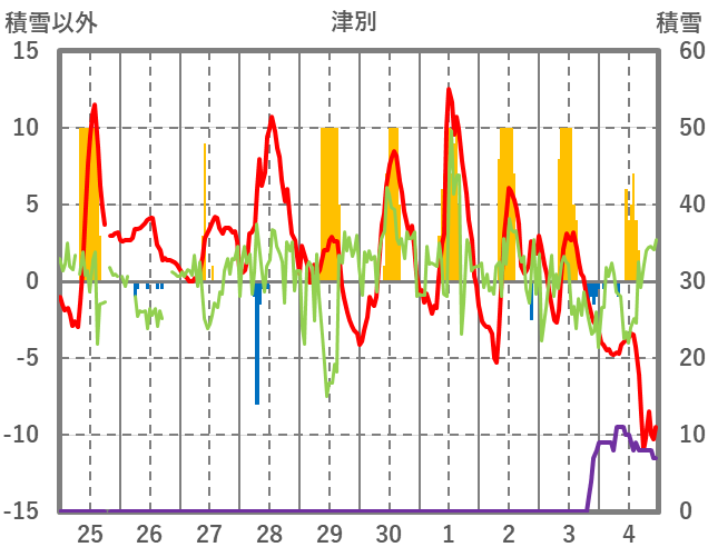 | 日 | 時 | 気温 | 降水 | 風向/風速 | 日照 | 積雪 | 降雪 |