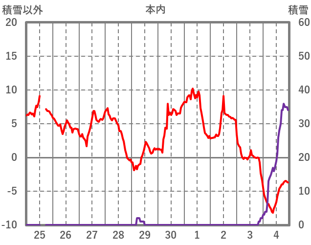 | 日 | 時 | 気温 | 降水 | 風向/風速 | 日照 | 積雪 | 降雪 |
