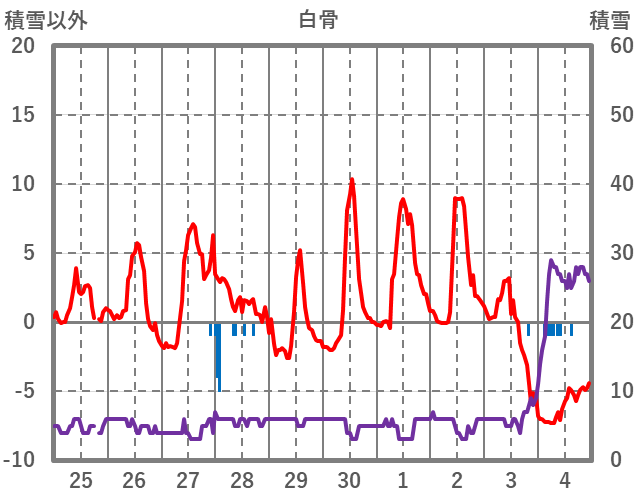 | 日 | 時 | 気温 | 降水 | 風向/風速 | 日照 | 積雪 | 降雪 |