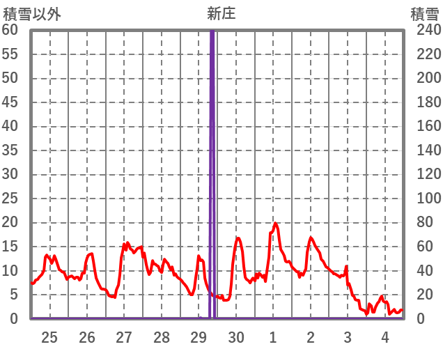 | 日 | 時 | 気温 | 降水 | 風向/風速 | 日照 | 積雪 | 降雪 |