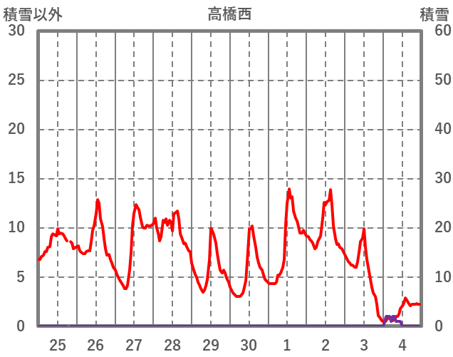| 日 | 時 | 気温 | 降水 | 風向/風速 | 日照 | 積雪 | 降雪 |